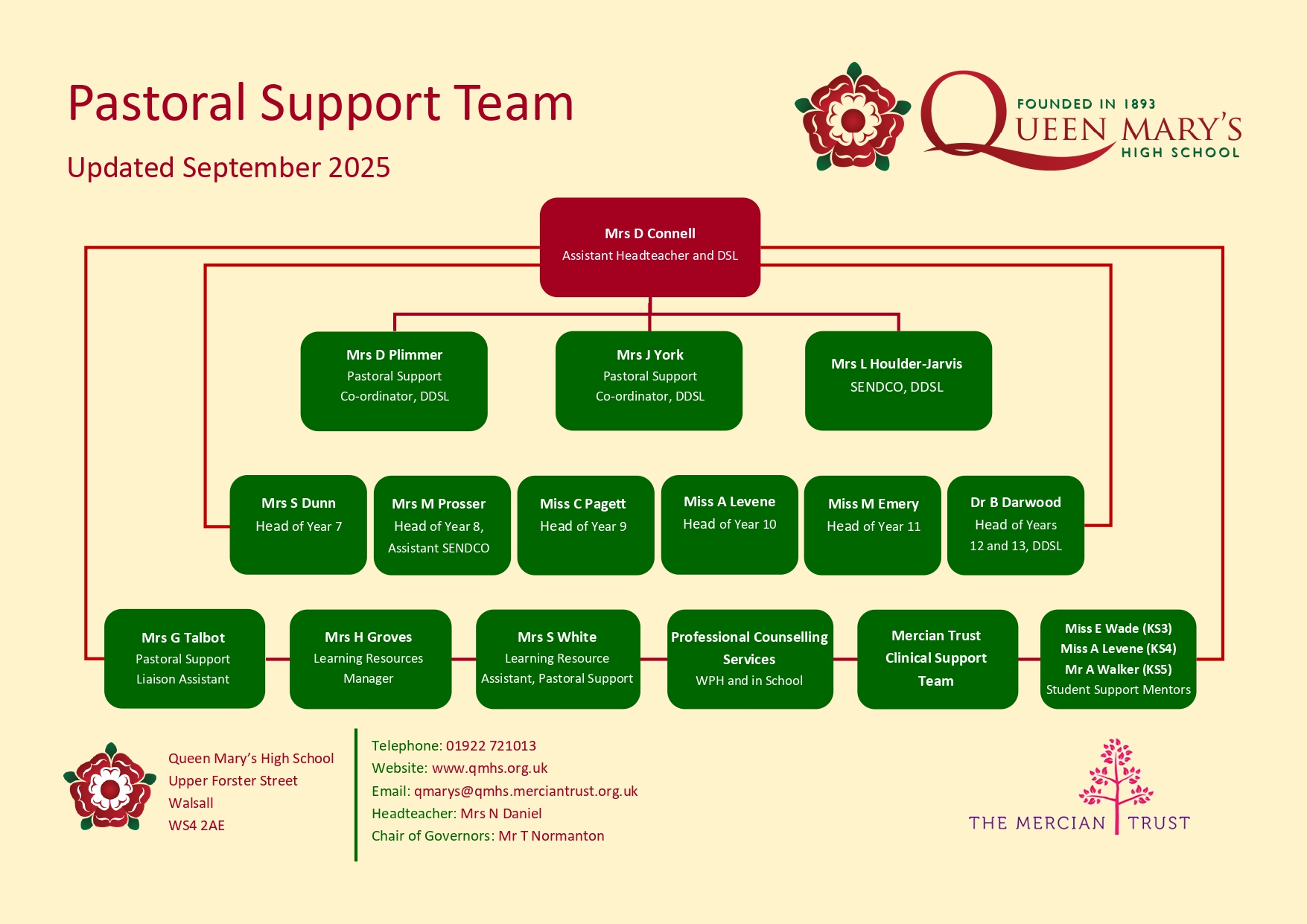 To get in touch with any of these members of staff please phone the school line 01922 721013 or email qmarys@qmhs.merciantrust.org.uk titled for the attention of:
