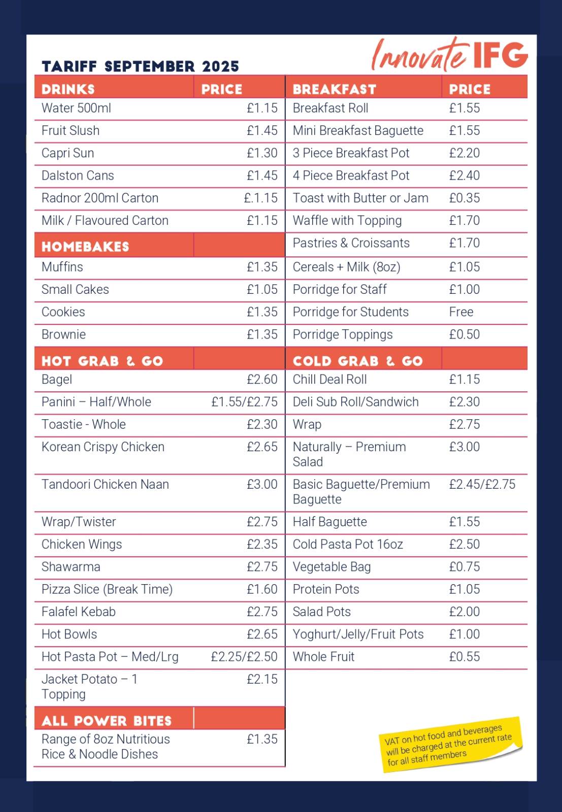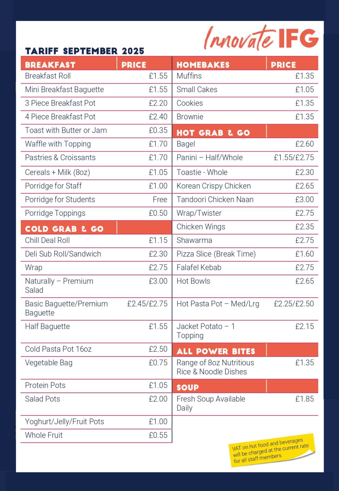 Innovate provide menus to suit all tastes, diets and price points; from break-time snacks starting at £1.00 through to full lunchtime meals. Typical prices for items at break time start from £0.75p with a main meal and dessert being £2.60. We also have a range of meal deals starting at £2.60 and includes the very popular Blue Dot Deal which includes 4 items for £2.60.