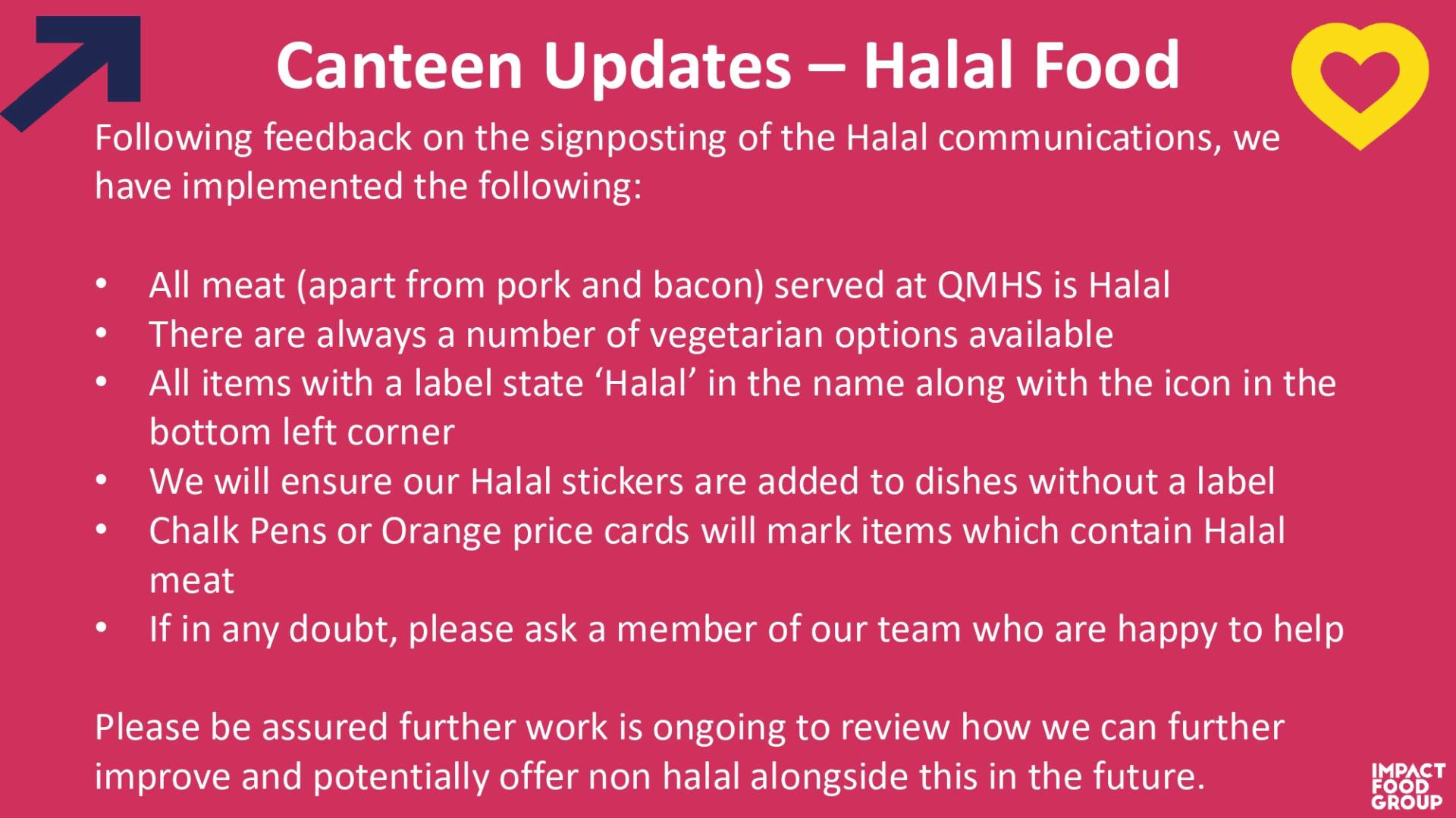 Catering provision support including food offer and prices: Email qmhs@impactfood.co.uk Innovate will respond.